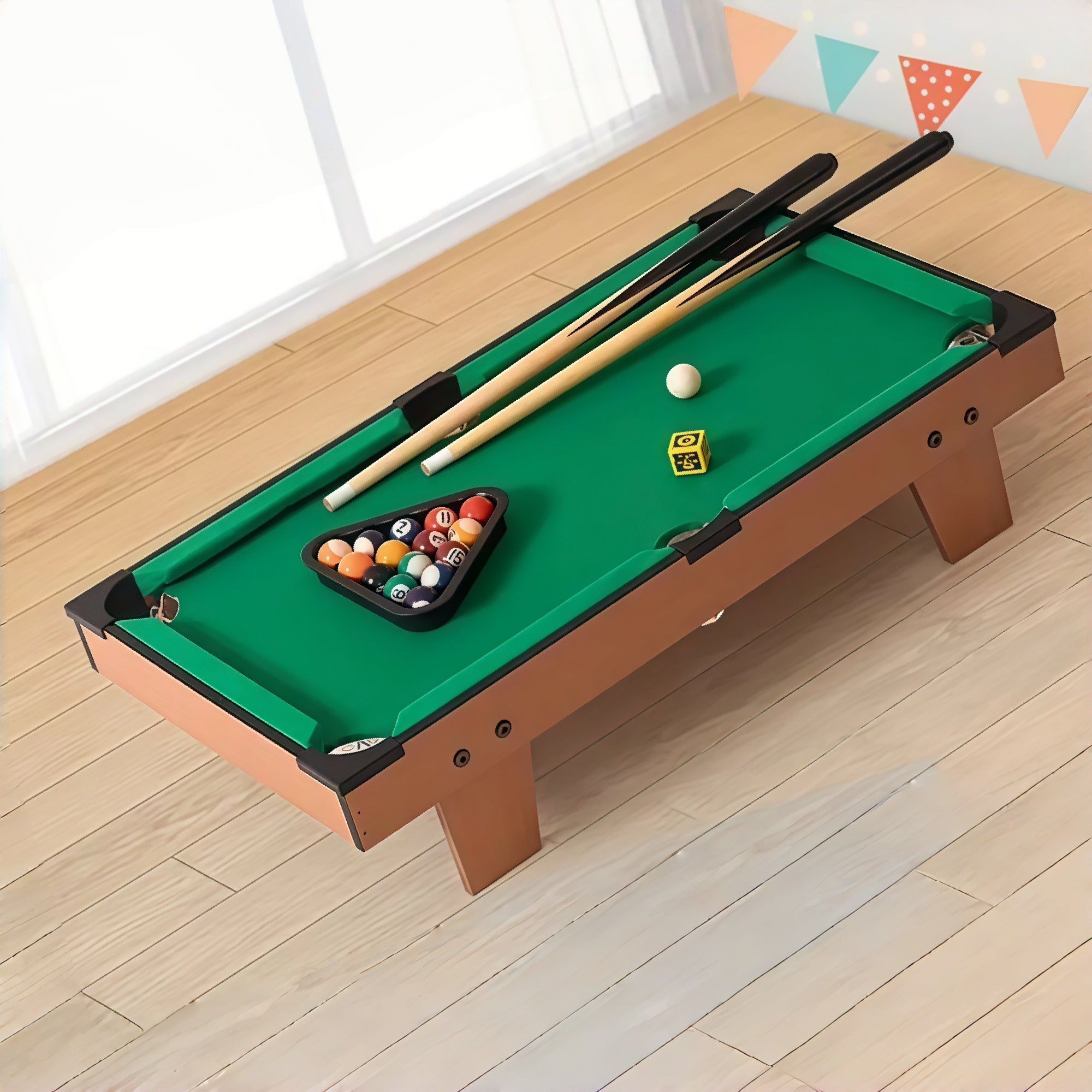 The Mini Billiard Table offers a fun, compact way to play pool indoors. Made with durable MDF and realistic features, it's perfect for family entertainment and kids learning the game.
